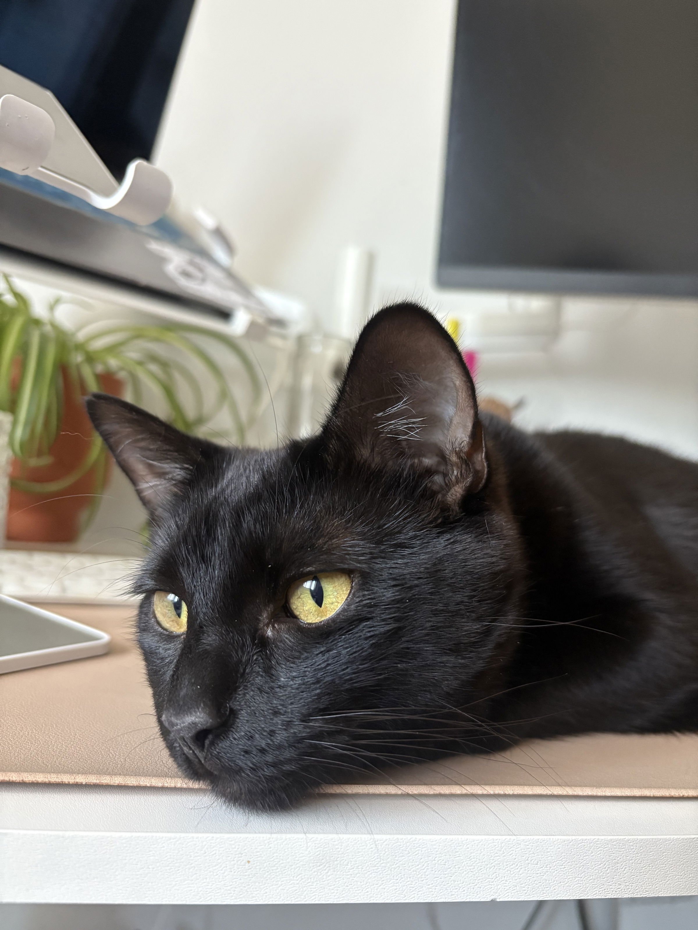 She likes to sit on the corner of my desk and slap her tail around while I type, or wrap her arms around my right arm while I’m working on live website changes. She’s playful, persistent, and always seems to know when I need a break, a hug, or a reset.